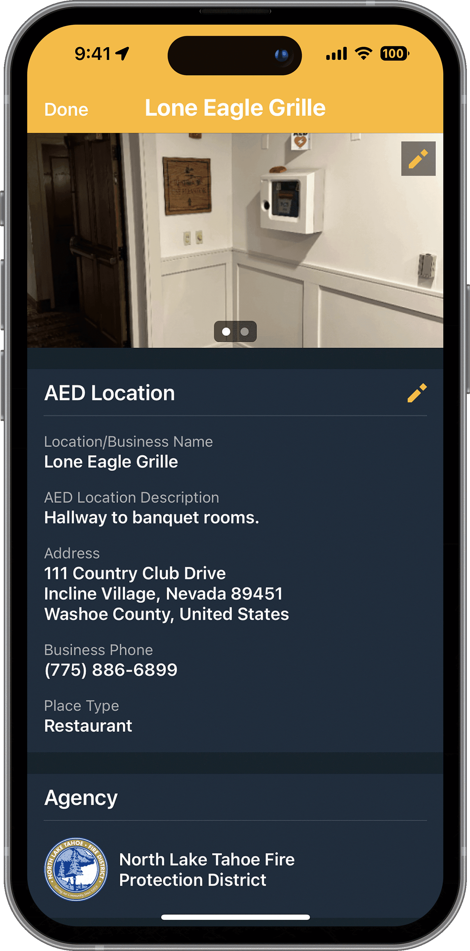 All user levels can view the AED map layer. Tapping an AED icon displays additional details including business/location name, AED location description, business open/closed status, and a contextual image of the AED, if available.