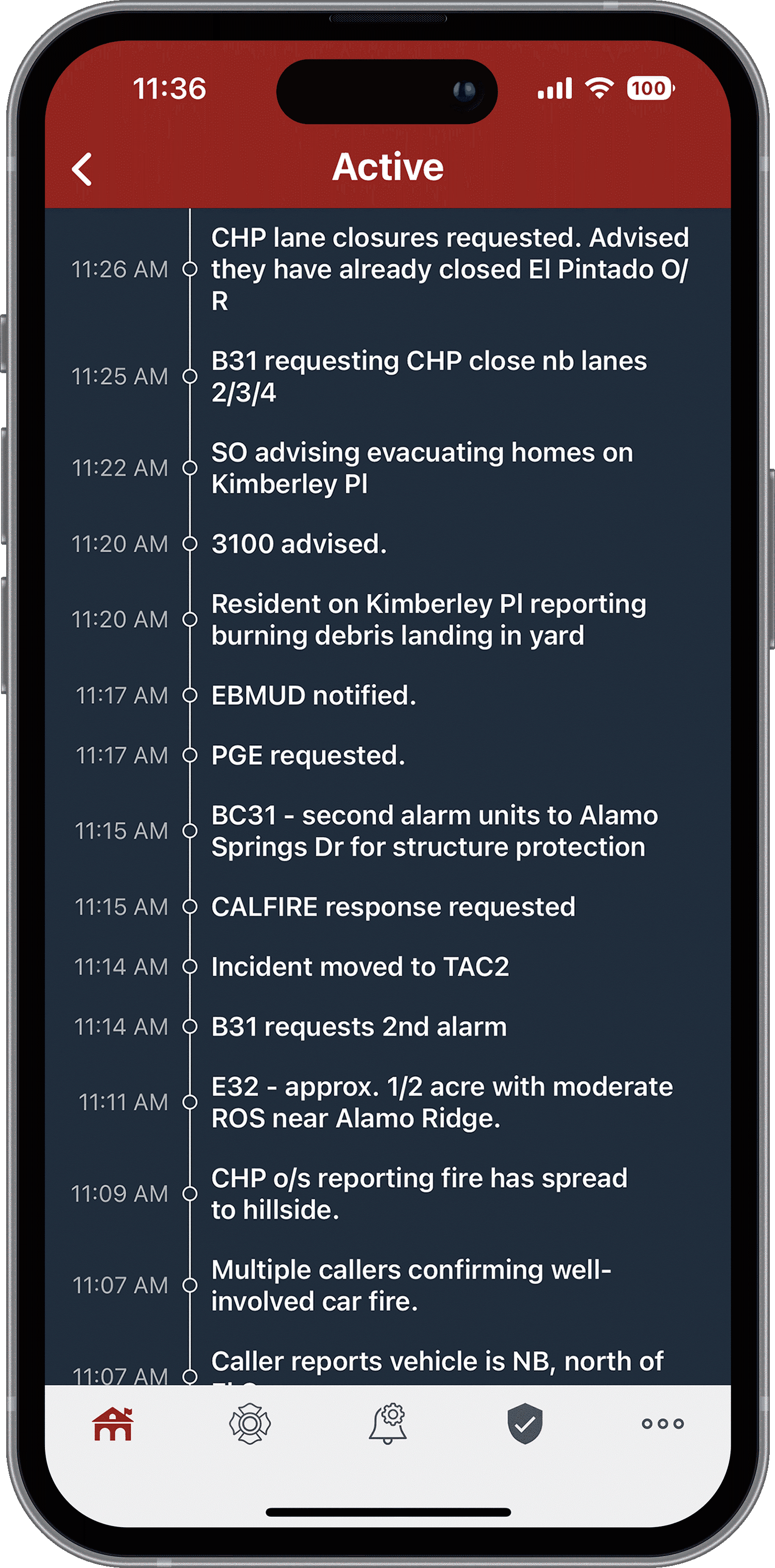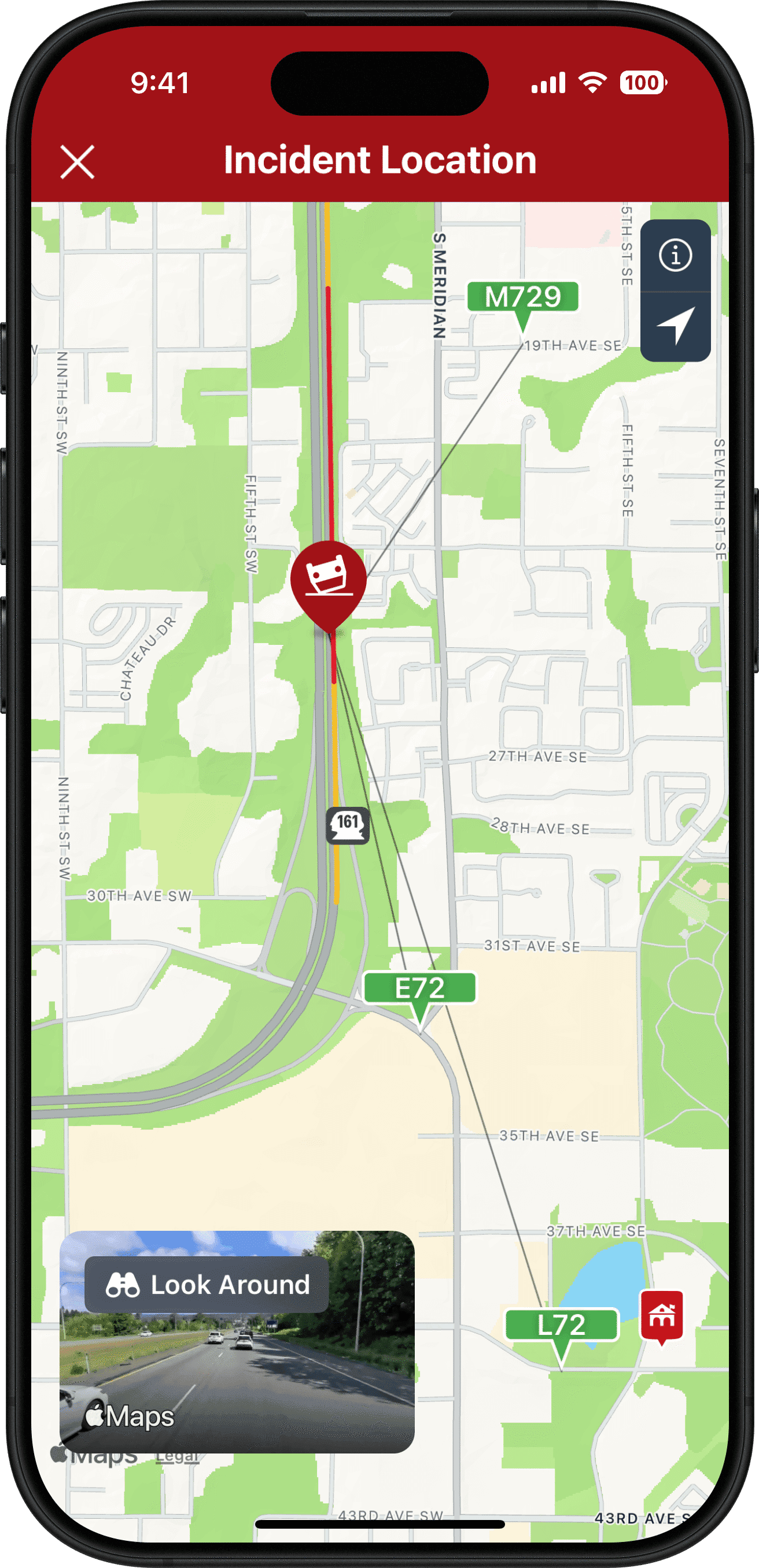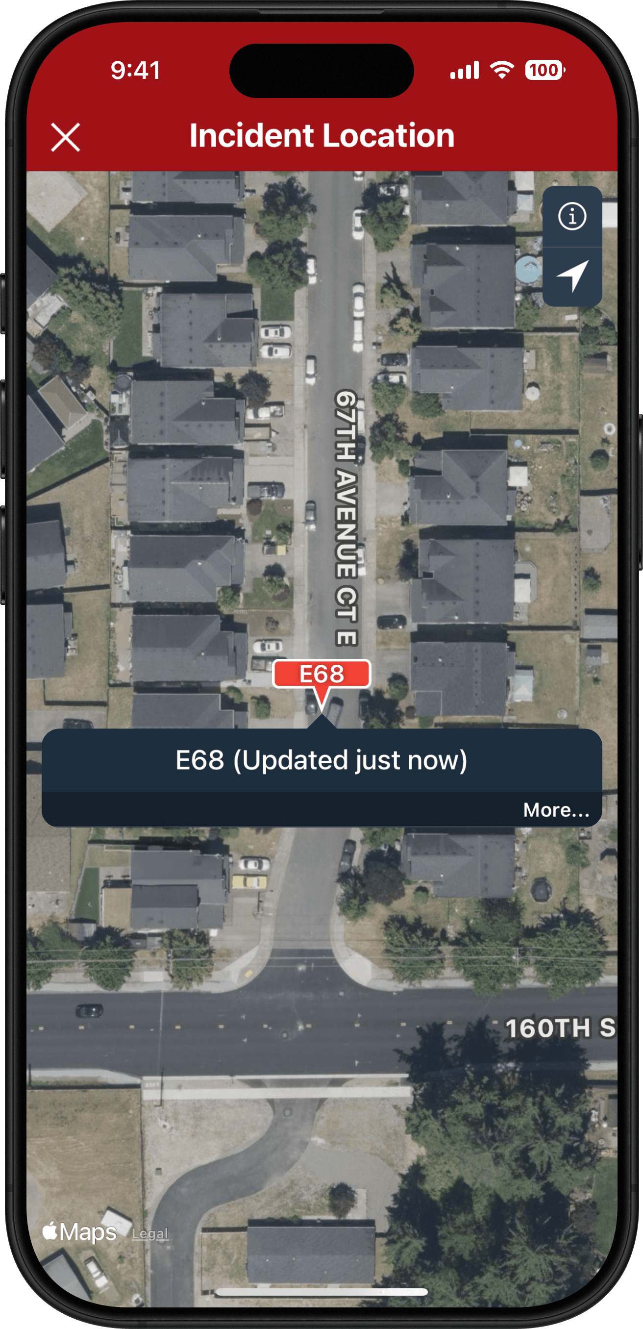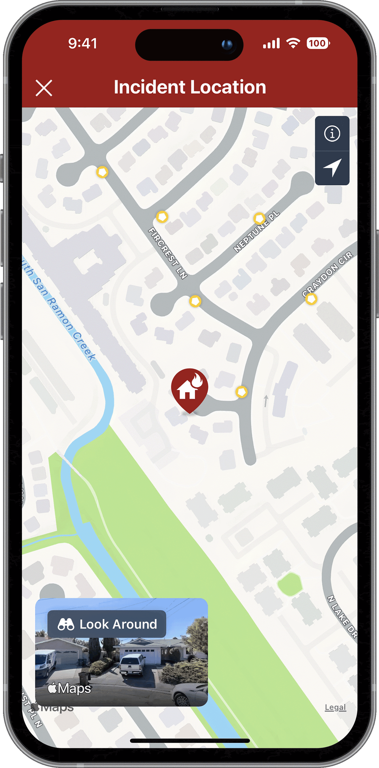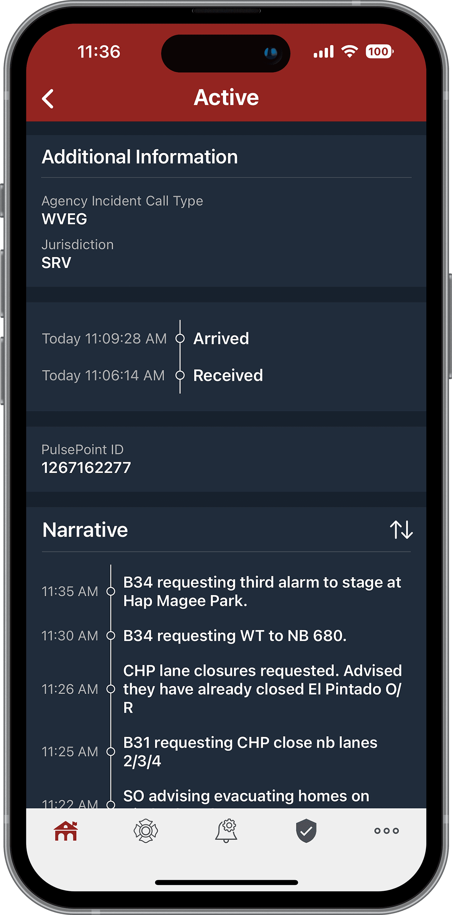 From a tap on the incident list, Professional Responders are provided additional details to improve their response capabilities and effectiveness. Available information varies between dispatch environments, but common data points include common place names, cross streets, radio channels, and incident narratives.