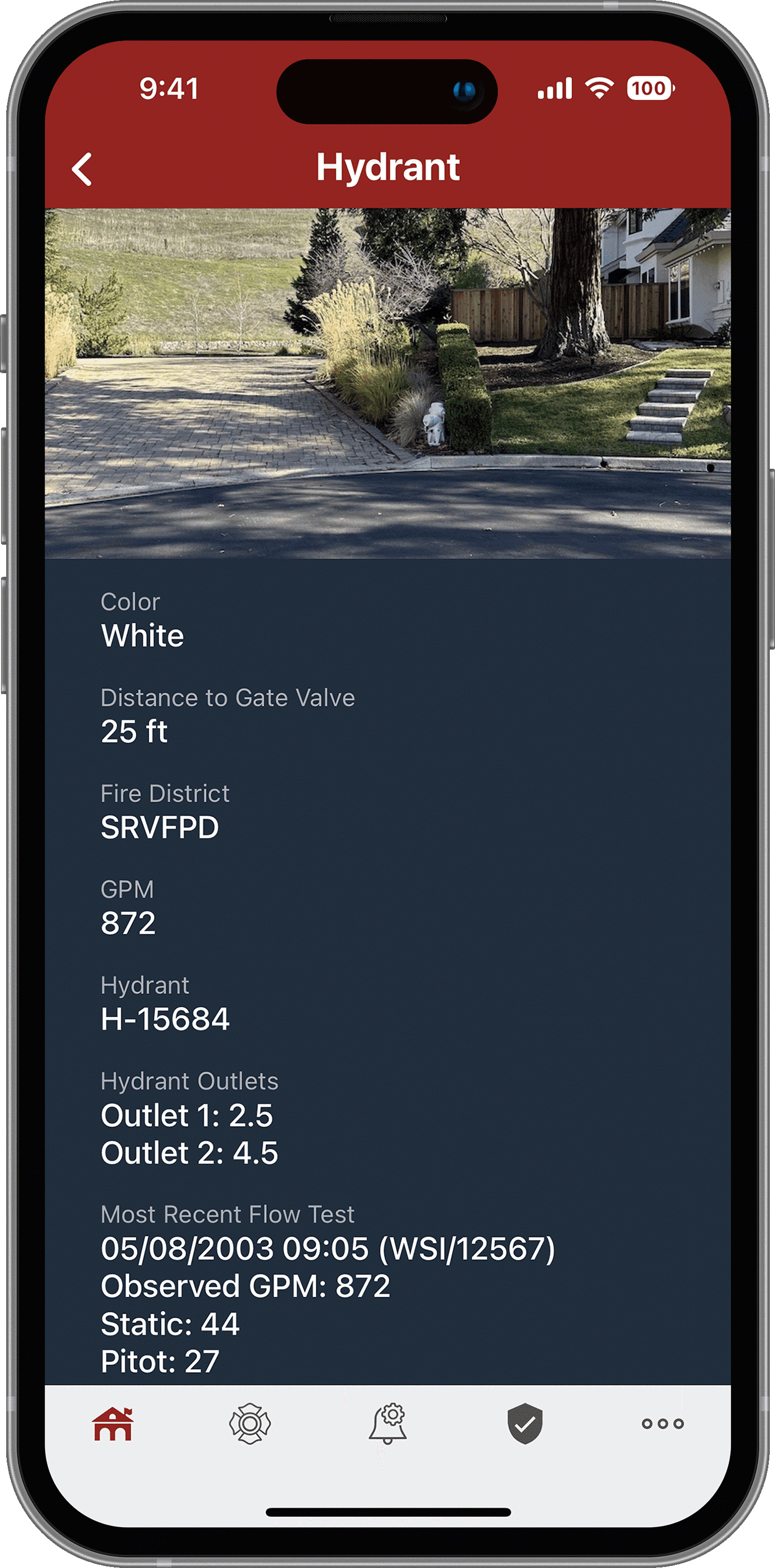 Firefighters can easily display the fire hydrant map layer when responding to incidents that may require a hydrant. Icon colors can be used to indicate expected hydrant performance or to meet other local standards. Tapping a hydrant icon displays additional hydrant characteristics, such as flow and outlet configuration, if available.