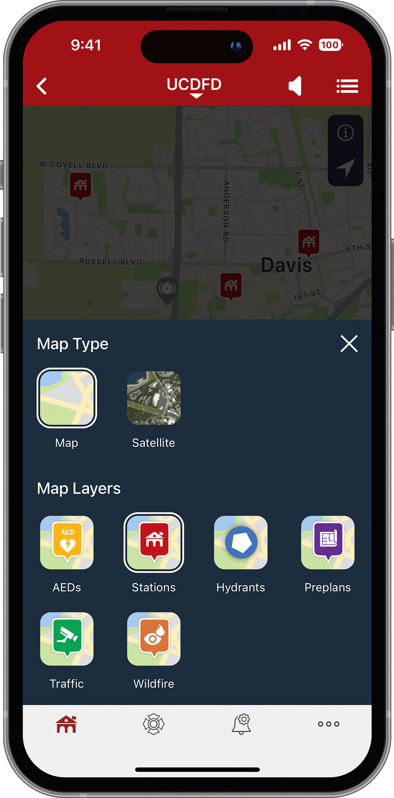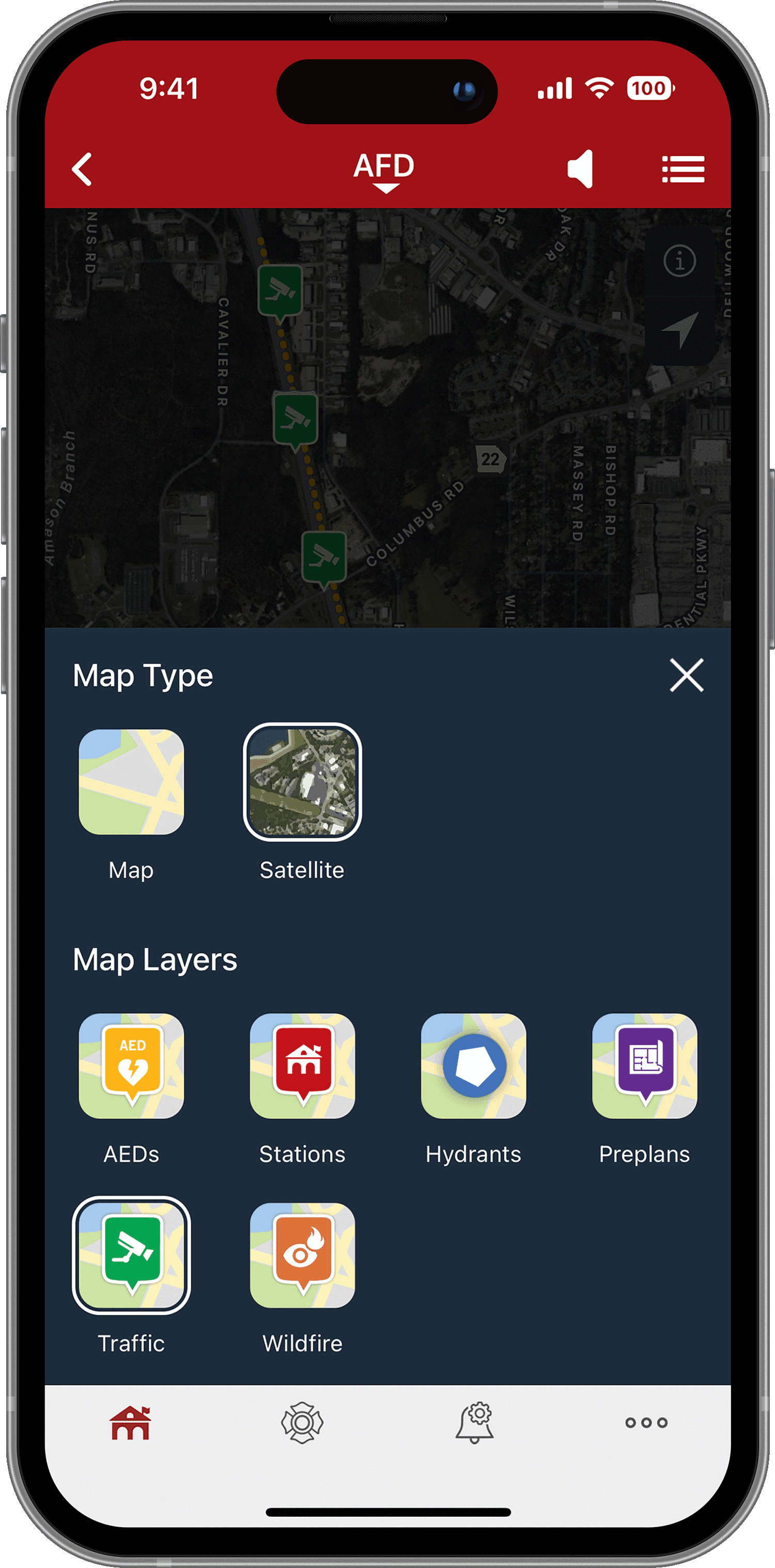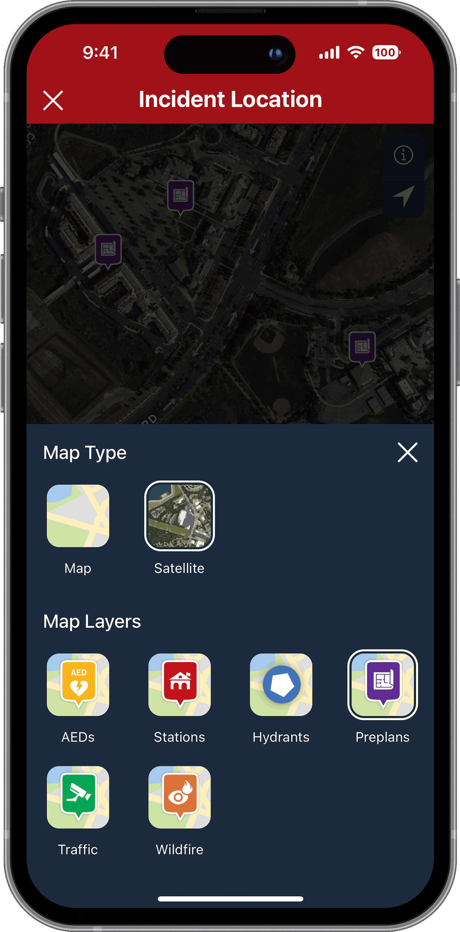 The map thumbnail at the top of the details page opens to a full-screen, single-incident response map. This map displays map layers such as hydrants and preplans, real-time traffic conditions, and additional response aids such as destination view imagery. Since PulsePoint is an app, every crew member has access to this information—not just one seat.