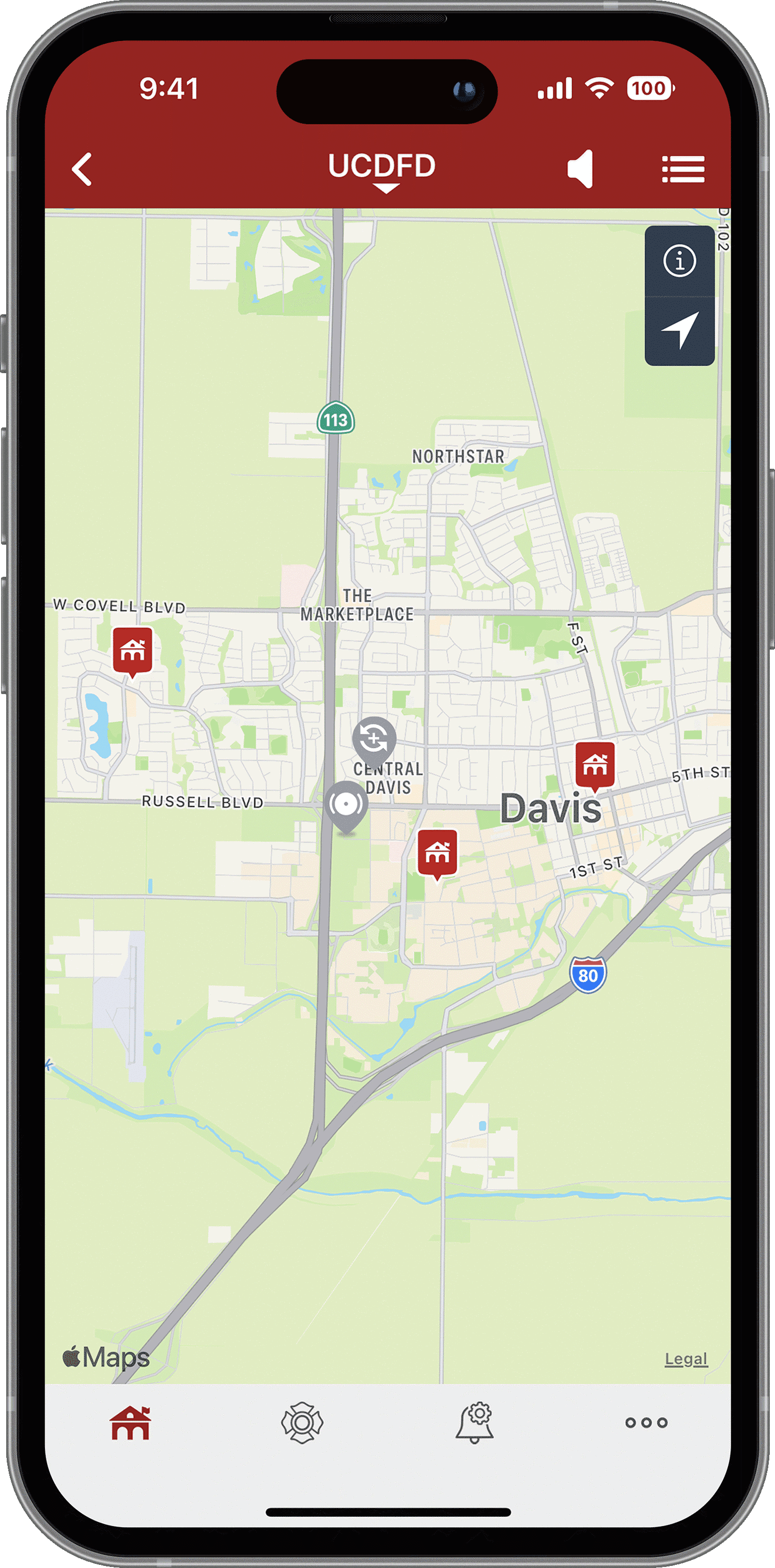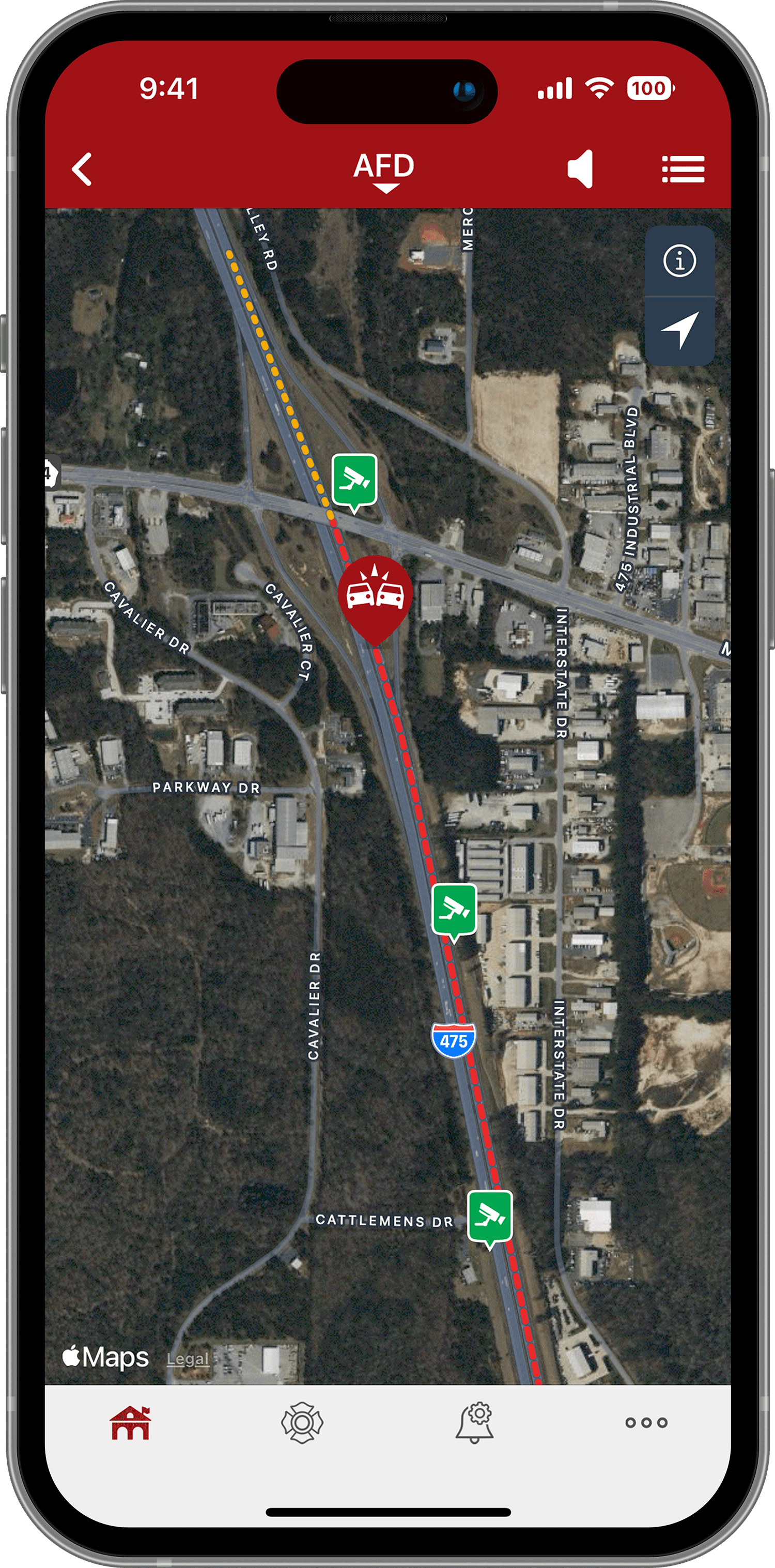Units are displayed on the map color-coded according to their current dispatch status. Tap the icon to display additional unit information. Subtle lines indicate which units are traveling to which incidents.