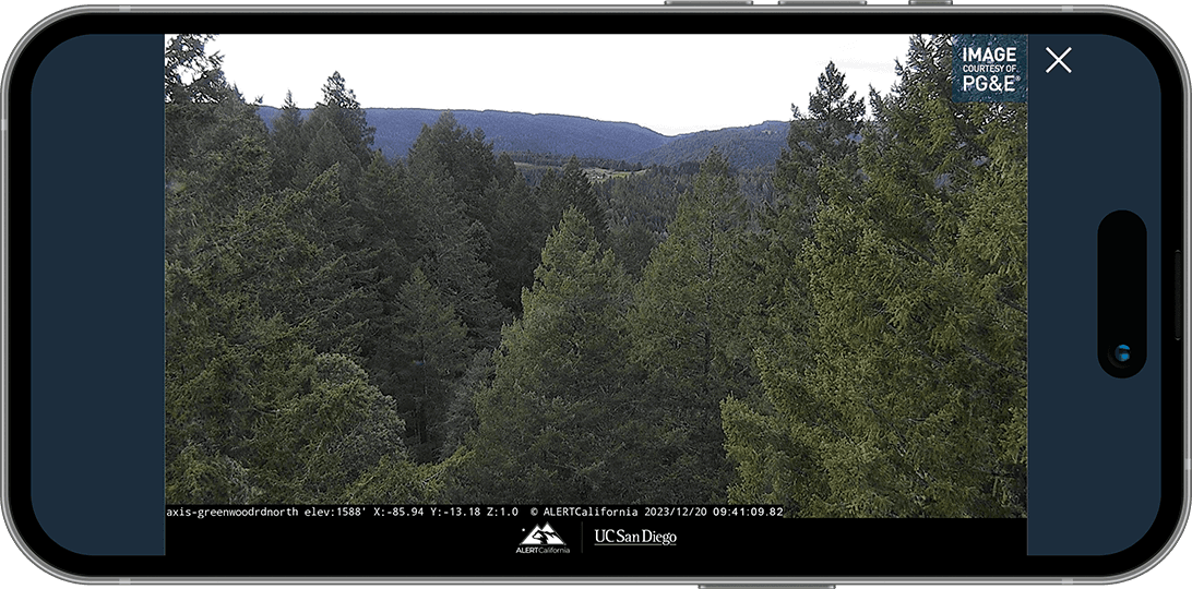 Orange fire watch icons indicate the location of wildfire cameras. Tap the icon to display tower imagery. Swipe to move between camera views (a dot sequence icon indicates additional camera positions are available).